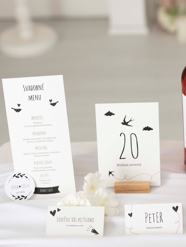Objednajte si svadobné menovky na stôl, nálepky, svadobné menu a iné a iné.